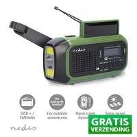 - Ta-start="3858" data-end="3877"> Merk: Nedis - Model: RDDBCR2000GN - Type radio: Noodradio, draagbaar - campingradio - kampeerradio - Ontvangst: DAB+ en FM - 40 voorkeurzenders - Oplaadmethodes: USB-C, zonnepaneel, handslinger - Batterij: Ingebouwde 2500 mAh lithium-ion - Powerbank, USB-A uitgang - Lichtfuncties: LED-zaklamp en leeslamp - Alarm: SOS-alarm en dubbel alarm - Display: LCD met klok - Kleur: groen/zwart - afmetingen: 147 74 52 mm - Gewicht: 288 gram - EAN: 5412810444175